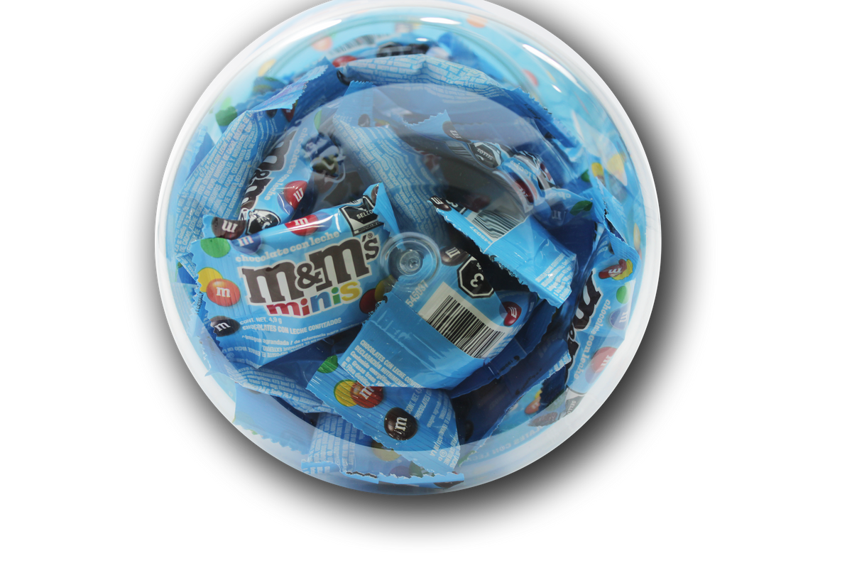 Los clásicos chocolates M&M's en su versión miniatura, presentados en un práctico vitrolero.