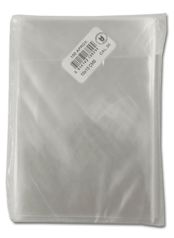 Bolsa de celofán grado alimenticio (polipropileno), mide 15 cm de alto y 10 cm de ancho. Cada paquete contiene 100 piezas.