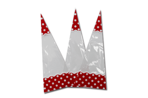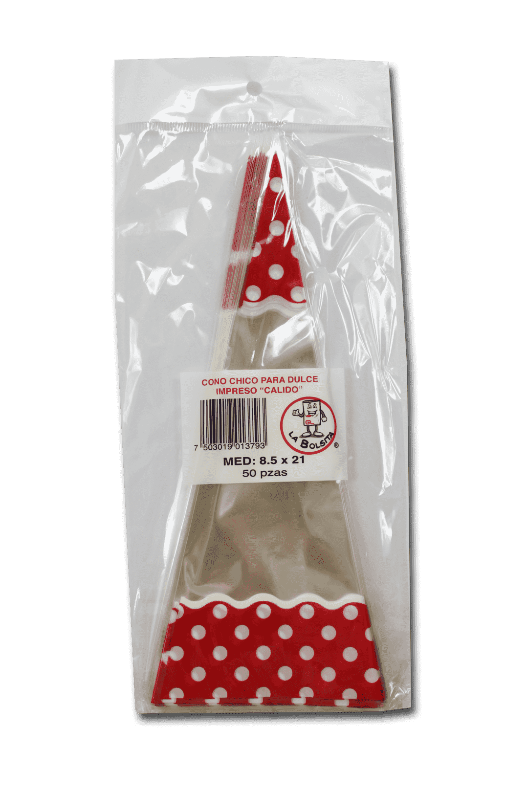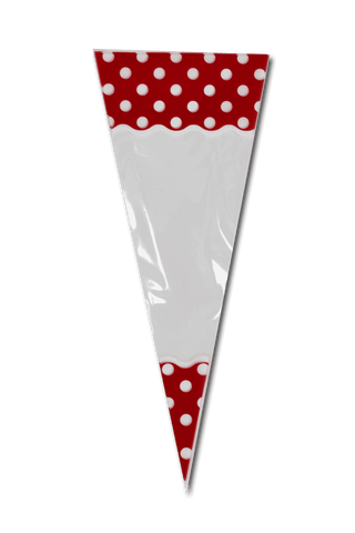 Bolsa de celofán cónica, mide 21 cm de alto y 8.5 cm de ancho. Cada paquete contiene 50 piezas.