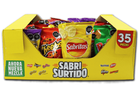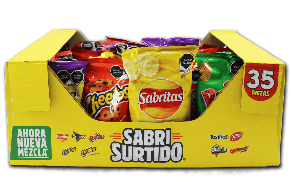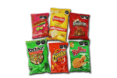Surtido de botanas que puede incluir Sabritas, Doritos, Ruffles, Chetos, Chetos Flamin´ hot, Tostitos, Fritos, Rancheritos y Churrumaiz