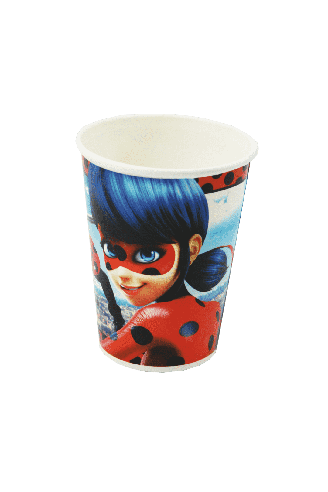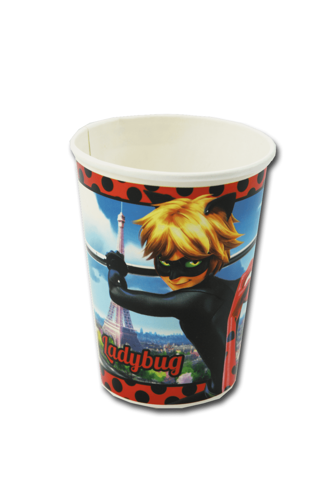 Vaso temático de Lady Bug, perfecto para complementar la decoración en fiestas infantiles.