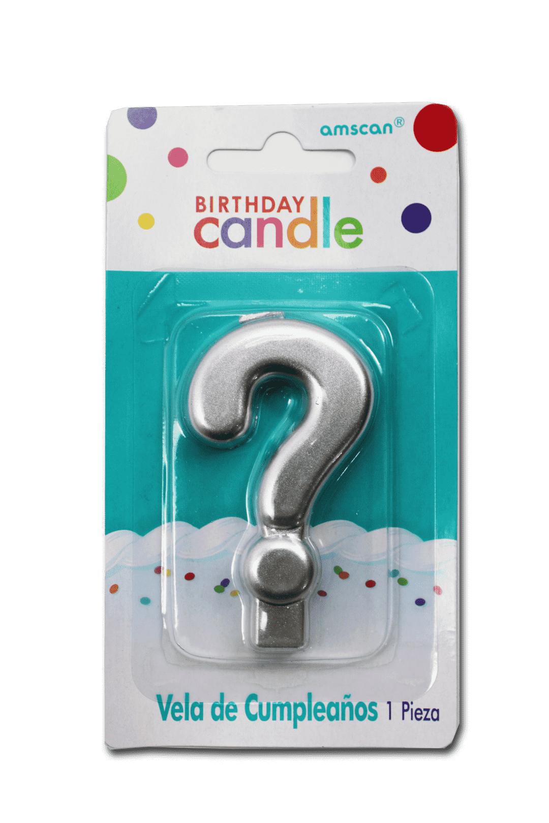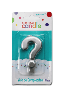 Vela para pastel en color plateada de símbolo ?, perfecta para celebraciones elegantes.